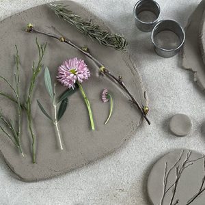 Wir fertigen Schale und/oder Teller sowie kleine Anhänger und verzieren eure handgefertigten Stücke indem wir Naturmaterialen wie Gräser, Blumen, Kräuter etc. als Stempel nutzen.